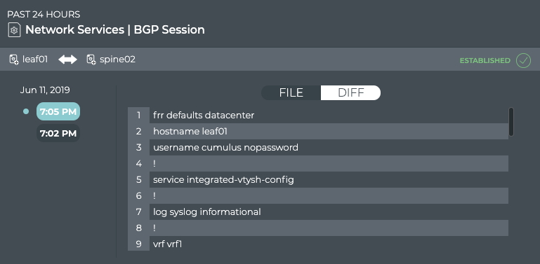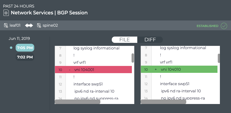 Each time a change is made to the configuration file for the BGP service, NetQ logs the change and enables you to compare it with the last version using the NetQ UI. This can be useful when you are troubleshooting potential causes for alarms or sessions losing their connections.