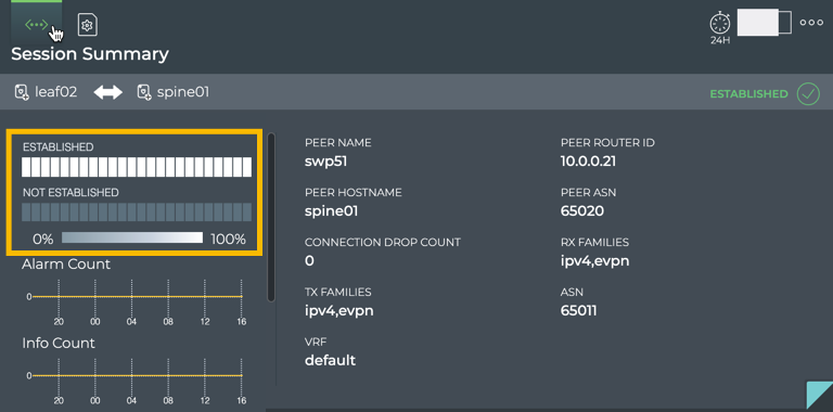 From this card, you can view the alarm and info event counts, Peer ASN, hostname, and router id, VRF, and Tx/Rx families identifying the session in more detail. The Connection Drop Count gives you a sense of the session performance.