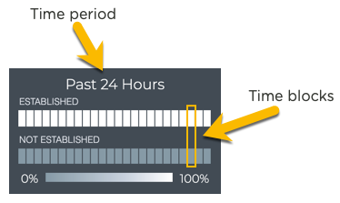 On the medium and large single BGP session cards, vertically stacked heat maps represent the status of the sessions; one for established sessions, and one for unestablished sessions. Depending on the time period of data on the card, the number of smaller time blocks indicate that the status varies. A vertical stack of time blocks, one from each map, includes the results from all checks during that time. The results appear by how saturated the color is for each block. If only established sessions occurred during that time period for the entire time block, then the top block is 100% saturated (white) and the unestablished block is zero percent saturated (gray). As unestablished sessions increase in saturation, the established sessions block is proportionally reduced in saturation. An example heat map for a time period of 24 hours appears here with the most common time periods in the table showing the resulting time blocks.