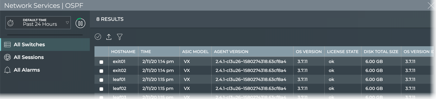 To view all device details, open the full screen OSPF Service card and click the All Switches tab.