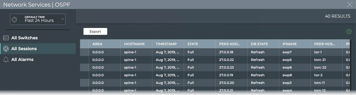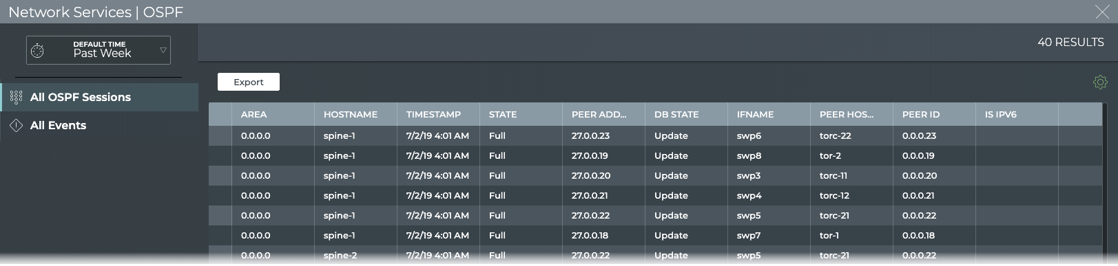 To view all session details, open the full screen Network Services|All OSPF Sessions card and click the All Sessions tab.