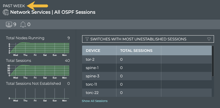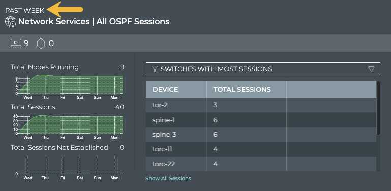 • Click Show All Sessions to investigate all OSPF sessions with events in the full screen card.