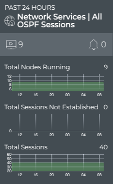 To view these distributions, open the medium Network Services|All OSPF Sessions card. In this example, there are nine nodes running the service with a total of 40 sessions. This has not changed over the past 24 hours.