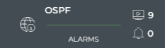 To view the summary, open the Network Services|All OSPF Sessions card. In this example, the number of devices running the OSPF service is nine (9) and the number and distribution of related critical severity alarms is zero (0).