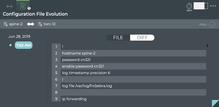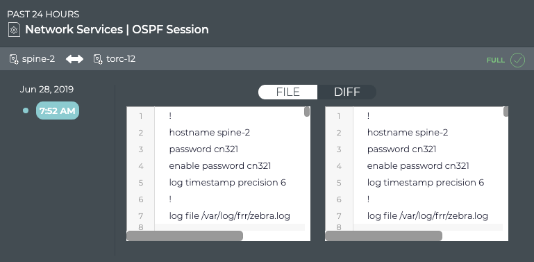 Each time a change is made to the configuration file for the OSPF service, NetQ logs the change and enables you to compare it with the last version using the NetQ UI. This can be useful when you are troubleshooting potential causes for alarms or sessions losing their connections.