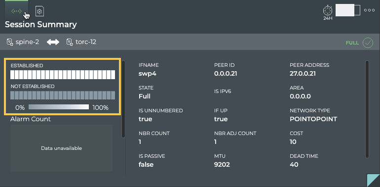 Switches or hosts experiencing a large number of OSPF alarms might indicate a configuration or performance issue that needs further investigation. You can view the devices sorted by the number of OSPF alarms and then use the Switches card workflow or the Alarms card workflow to gather more information about possible causes for the alarms. compare the number of nodes running OSPF with unestablished sessions with the alarms present at the same time to determine if there is any correlation between the issues and the ability to establish an OSPF session.