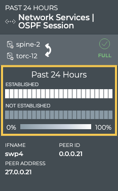 You can view the state of a given OSPF session from the medium and large Network Service|All OSPF Sessions card. For a given time period, you can determine the stability of the OSPF session between two devices. If you experienced connectivity issues at a particular time, you can use these cards to help verify the state of the session. If it was not established more than it was established, you can then investigate further into possible causes.