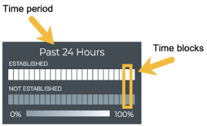 On the medium and large single OSPF session cards, vertically stacked heat maps represent the status of the sessions; one for established sessions, and one for unestablished sessions. Depending on the time period of data on the card, the number of smaller time blocks used to indicate the status varies. A vertical stack of time blocks, one from each map, includes the results from all checks during that time. The results appear by how saturated the color is for each block. If all sessions during that time period were established for the entire time block, then the top block is 100% saturated (white) and the unestablished block is zero percent saturated (gray). As sessions that are not established increase in saturation, the sessions that are established block is proportionally reduced in saturation. The following example heat map is for a time period of 24 hours, with the most common time periods in the table showing the resulting time blocks.