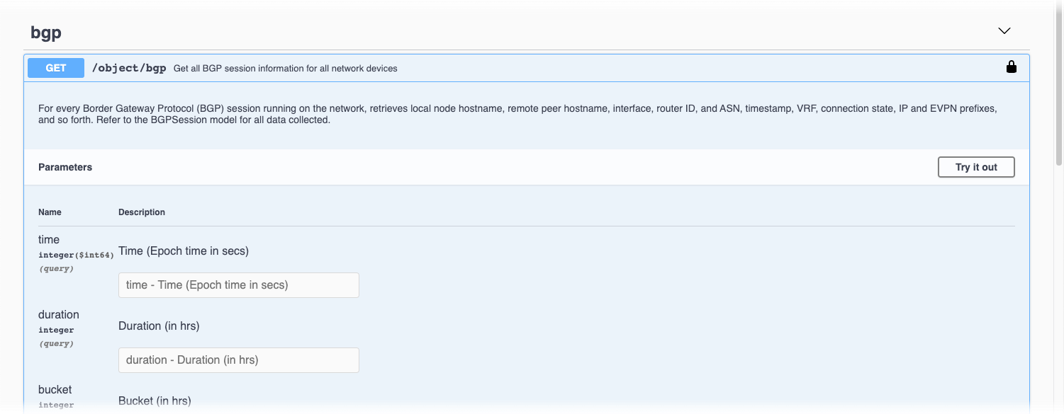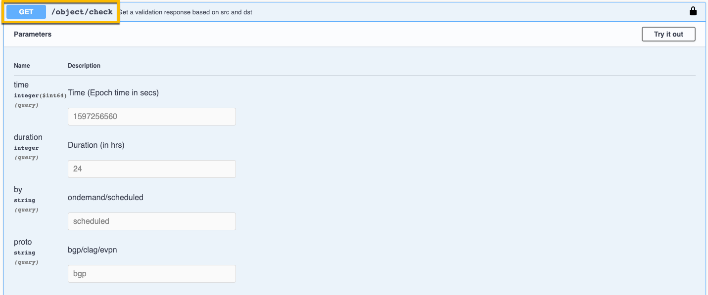 Run the following curl command, entering values for the various parameters. In this example, time=1597256560, duration=24 (hours), by=scheduled, and proto=bgp.