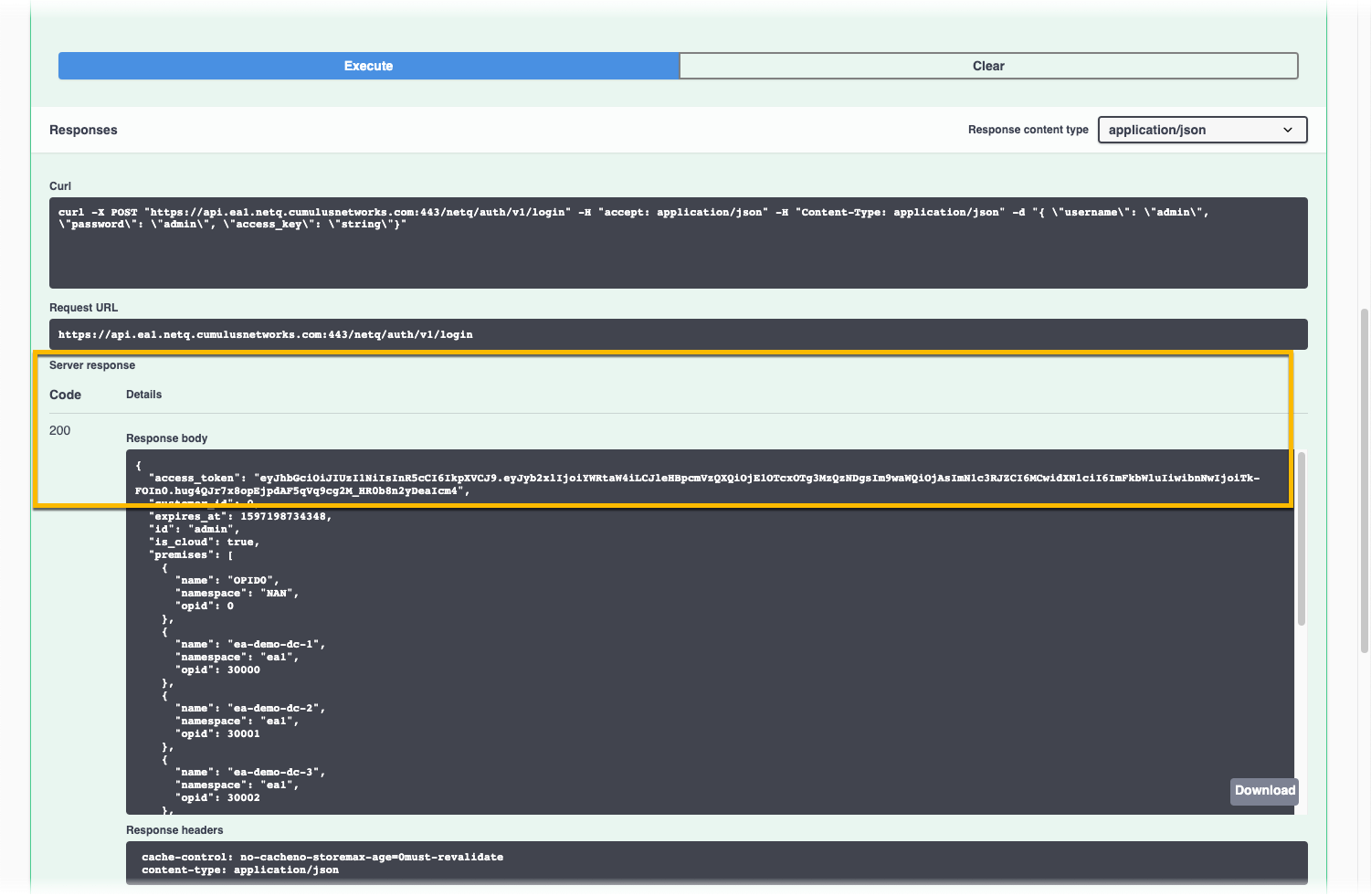 <computer-name>:~ <username>$ curl -X POST "https://api.192.168.0.10.netq.cumulusnetworks.com:443/netq/auth/v1/login" -H "accept: application/json" -H "Content-Type: application/json" -d "{ \"username\": \"admin\", \"password\": \"admin\", \"access_key\": \"string\"}"The output provides the access token as the first parameter.