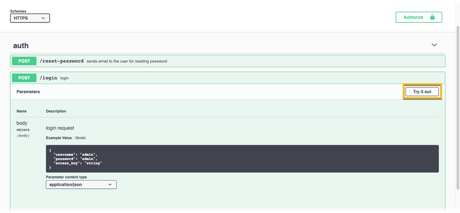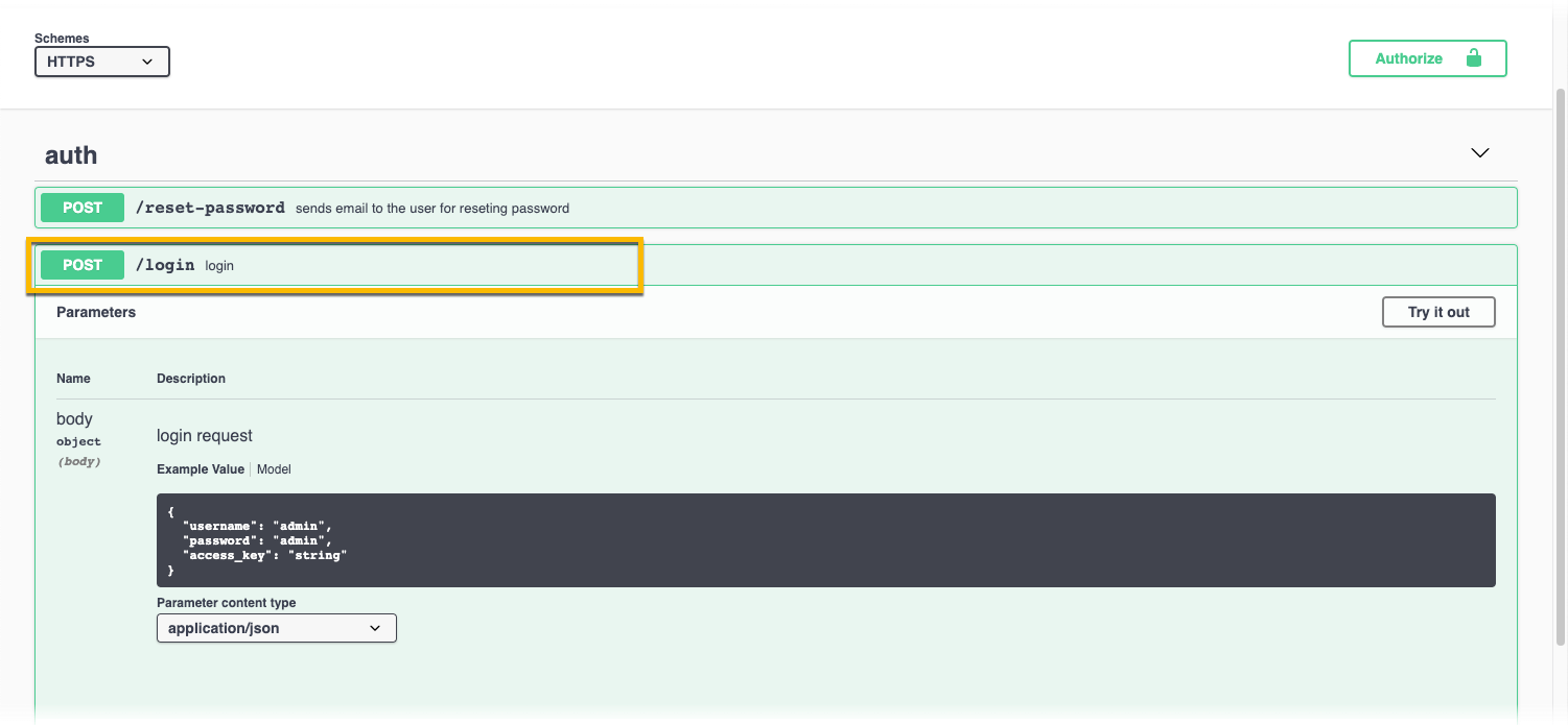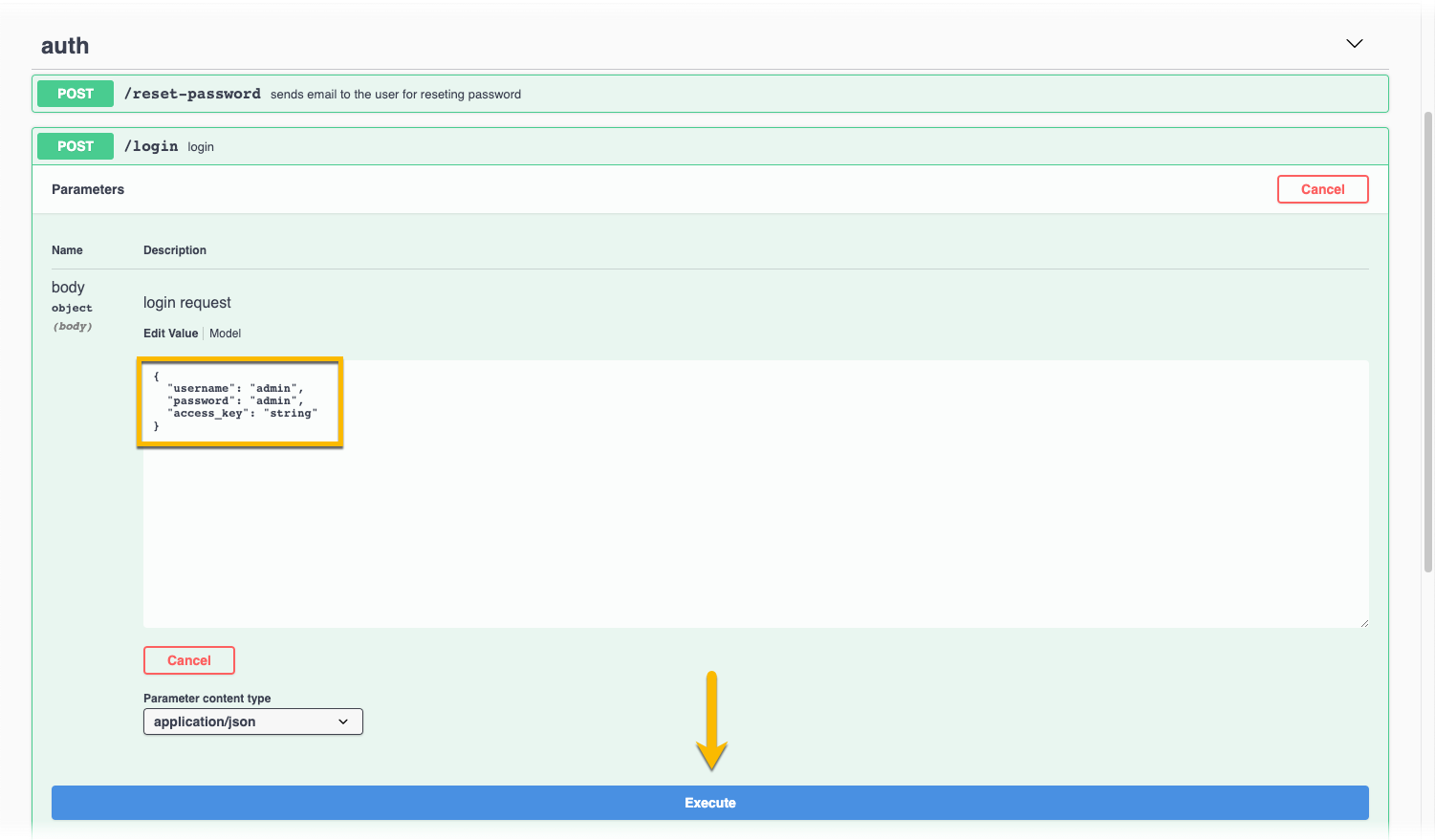 - Body = -d “{ "username": "admin", "password": "admin", "access_key": "string"}”