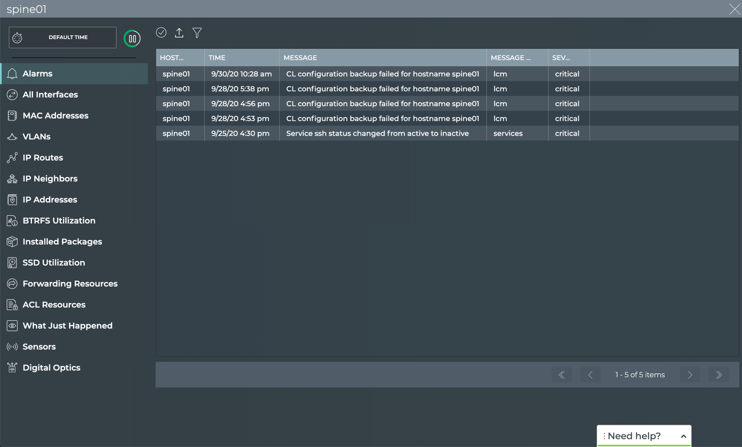 | Table/Filter options | When the Most Active filter option is selected, the table displays switches and hosts running the given service or protocol in decreasing order of alarm counts-devices with the largest number of warnings and failures are listed first. When the Most Recent filter option is selected, the table displays switches and hosts running the given service or protocol sorted by timestamp, with the device with the most recent warning or failure listed first. The table provides the following additional information: