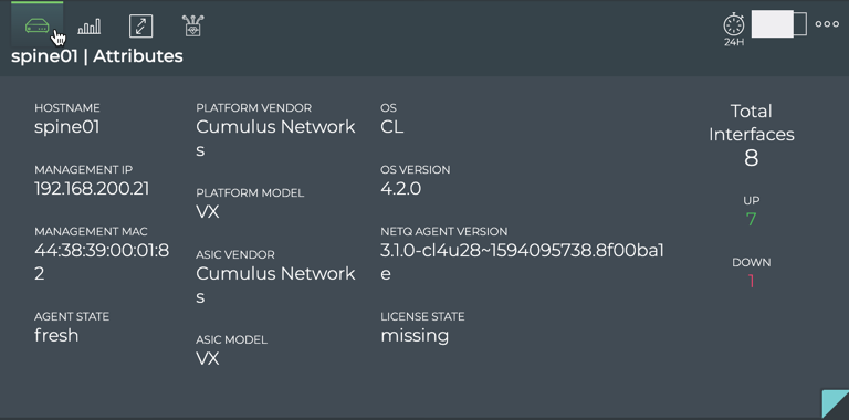 | Charts | Distribution of switch components (disk size, OS, ASIC, NetQ Agents, CPU, platform, and memory size), divided into software and hardware, during the designated time period. Hover over chart segment to view versions of each component. Note: You should only have one version of NetQ Agent running and it should match the NetQ Platform release number. If you have more than one, you likely need to upgrade the older agents. |