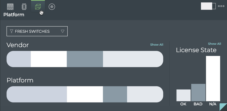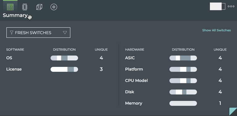 | Platform chart | Distribution of platform models. Hover over chart segment to view the number of switches with each model. |