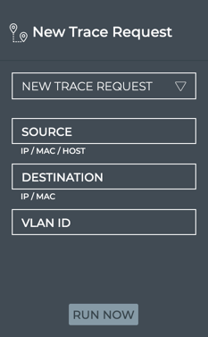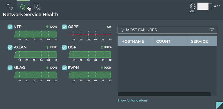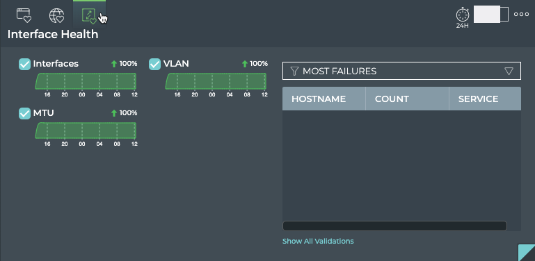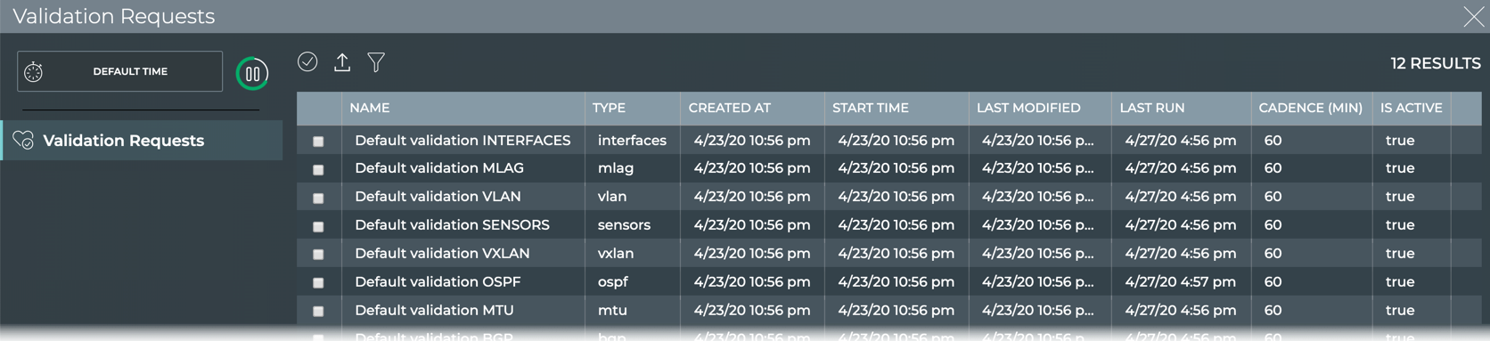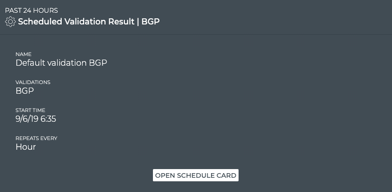 | Validation | Select a scheduled request to run that request on-demand. A default validation is provided for each supported network protocol and service, which runs a network-wide validation check. These validations run every 60 minutes, but you can run them on-demand at any time. Note: No new requests can be configured from this size card. |