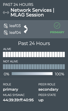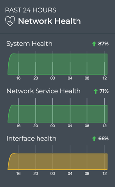 | Health score | Average of health scores for system health, network services health, and interface health during the last data collection window. The health score for each category is calculated as the percentage of items which passed validations versus the number of items checked. The collection window varies based on the time period of the card. For a 24 hour time period (default), the window is one hour. This gives you current, hourly, updates about your network health. |
