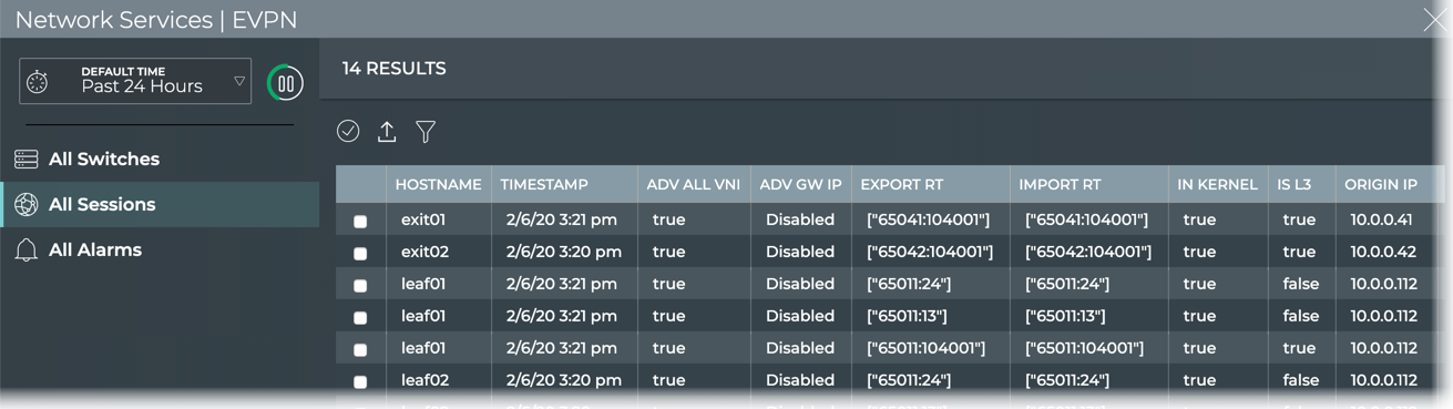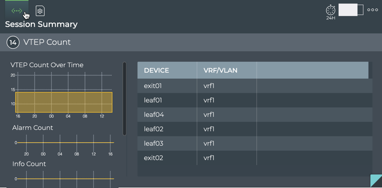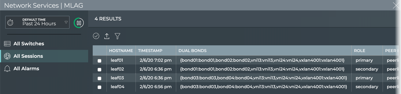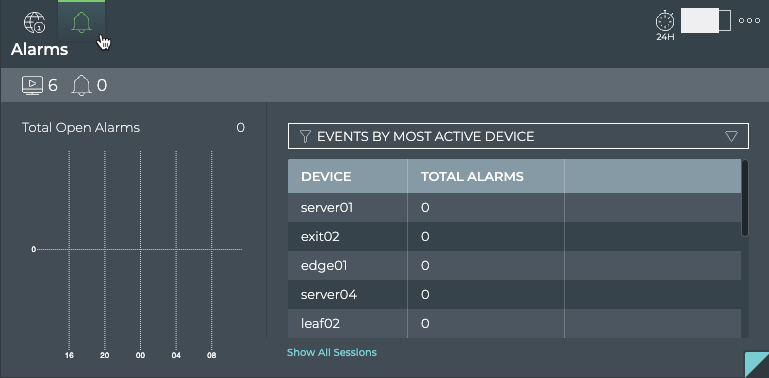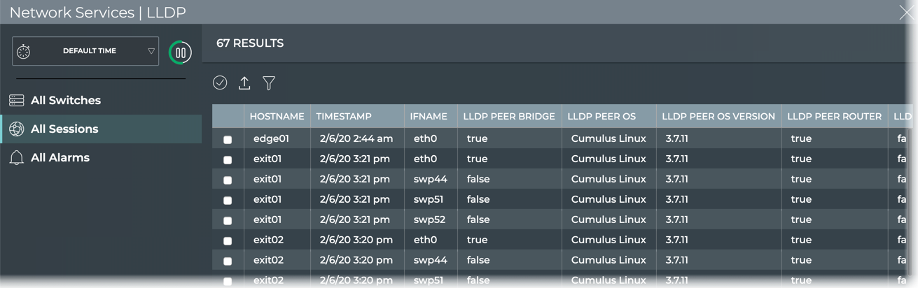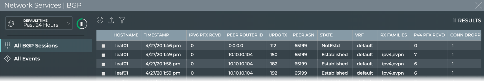 | Table/Filter options | When the Most Active filter option is selected, the table displays switches and hosts running the given service or protocol in decreasing order of alarm counts. Devices with the largest number of warnings and failures are listed first. You can click on the device name to open its switch card on your workbench. When the Most Recent filter option is selected, the table displays switches and hosts running the given service or protocol sorted by timestamp, with the device with the most recent warning or failure listed first. The table provides the following additional information: