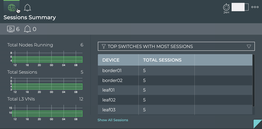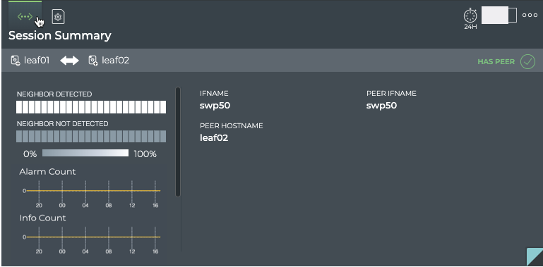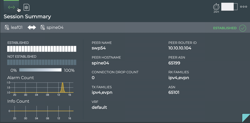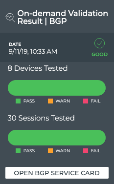 | Sessions Tested | For BGP, chart with total number of BGP sessions included in the validation and the distribution of the overall results. For EVPN, chart with total number of BGP sessions included in the validation and the distribution of the overall results. For Interfaces, chart with total number of ports included in the validation and the distribution of the overall results. In each of these charts: