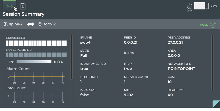 | Sessions Tested | For BGP, chart with total number of BGP sessions included in the validation and the distribution of the overall results. For EVPN, chart with total number of BGP sessions included in the validation and the distribution of the overall results. For Interfaces, chart with total number of ports included in the validation and the distribution of the overall results. For OSPF, chart with total number of OSPF sessions included in the validation and the distribution of the overall results. In each of these charts: