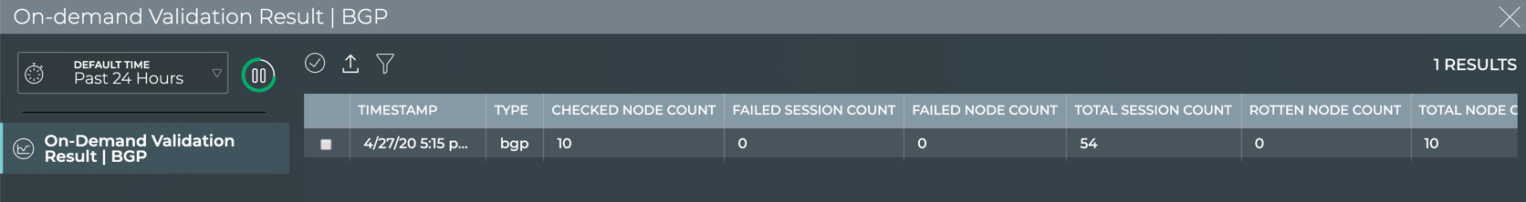 | On-demand Validation Result | <network protocol or service> | Displays all unscheduled validation results. By default, the results list is sorted by Timestamp. This tab provides the following additional data about each result: