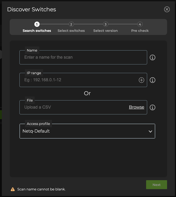 - Choose whether you want to look for switches by entering IP address ranges OR import switches using a comma-separated values (CSV) file.