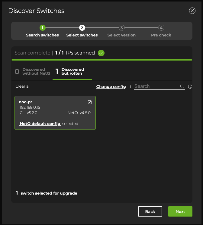 If the NetQ Agent is already installed on the switches you’d like to upgrade, follow the steps below. If the NetQ Agent is not installed on the switches you’d like to upgrade, run a switch discovery, then proceed with the upgrade.