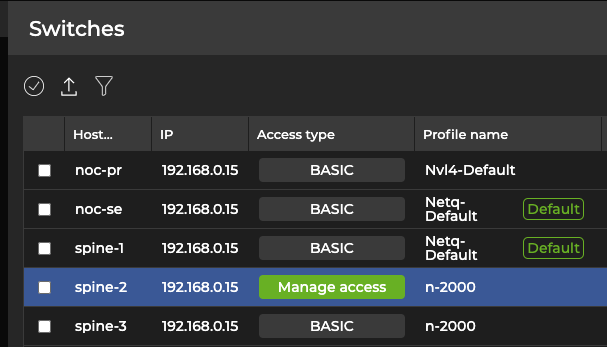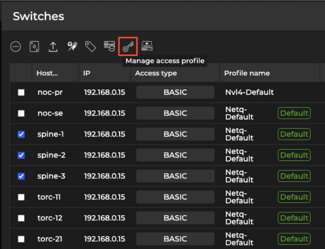 Select the switches you’d like to assign access profiles, then select Manage access profile above the table: