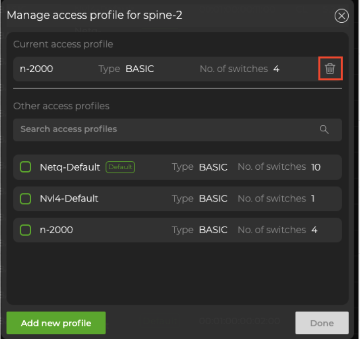 Detaching a profile from a switch restores it to the default access profile, Netq-Default.
