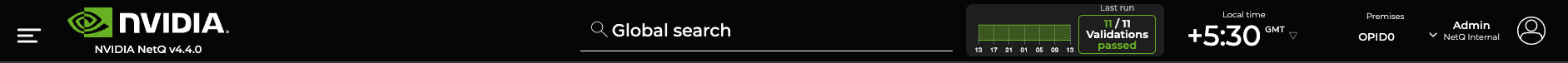 Application Header: Contains the main menu, NetQ version, search, validation summary, local time zone, premises list, and account information.
