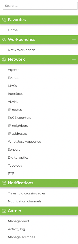 The NetQ UI contains two main areas: