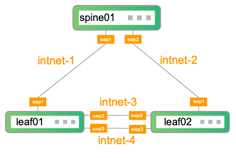 In the topology, leaf01 and leaf02 are the access layer switches on the network. leaf01 and leaf02 connect to spine01, which is the aggregation layer switch on the network. To facilitate additional configuration after the initial setup descibed in this guide, leaf01 and leaf02 also have two connections to each other.