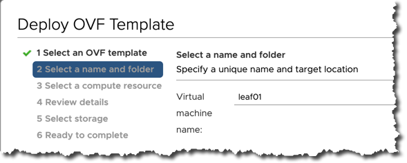 The following procedure creates leaf01, leaf02, and spine01 and the network connections between them. This section assumes you have VMWare vSphere experience.