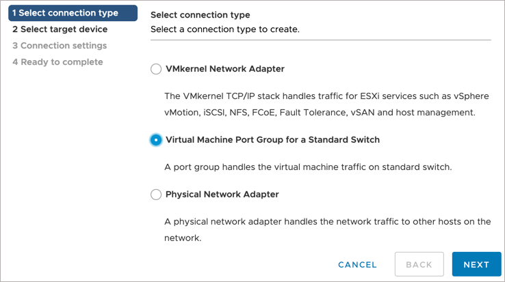 Select Virtual Machine Port Group for a Standard Switch, then click Next.