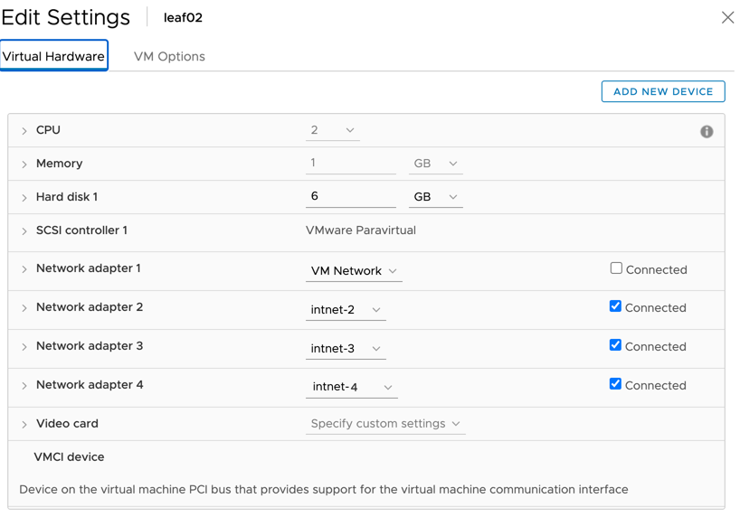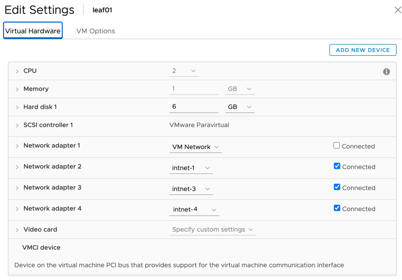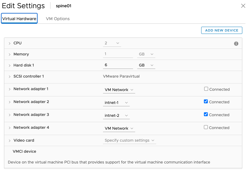 Configure the virtual hardware for each VM (leaf01, leaf02, and spine01):