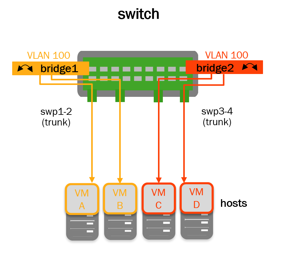 In the example below, bridges act like isolated switches. Because of this, it is possible for the isolated reuse of VLANs, by defining the VLANs inside of different logical switches (bridges). You declare to use vlan 100 on two separate bridges.