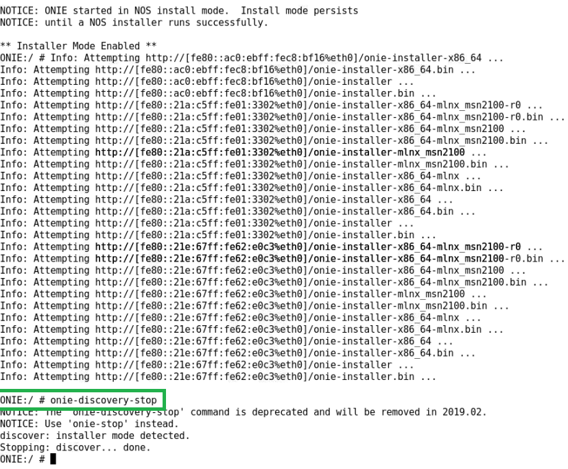 If you need to stop the process, press Enter and run the onie-discovery-stop command (or onie-stop in newer ONIE releases).