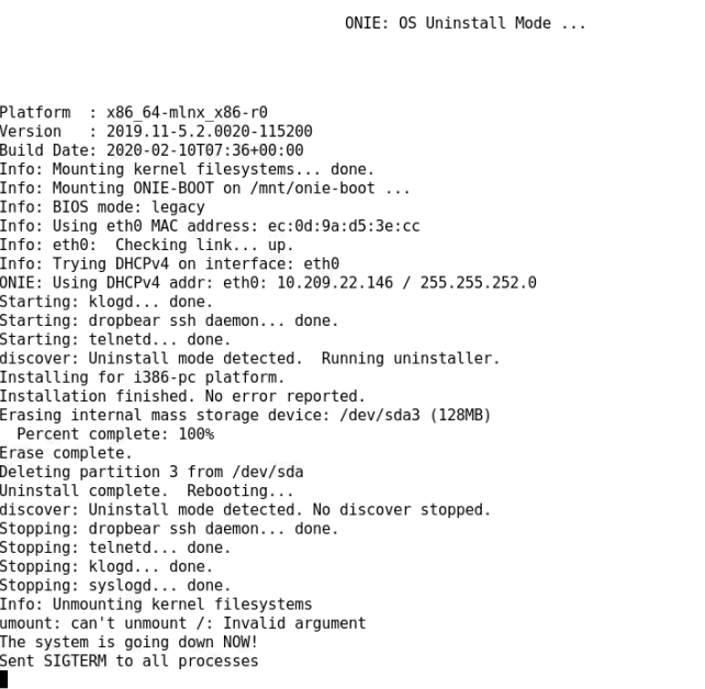 - The uninstallation process starts and can take up to 90 minutes. At the end of the process, the switch reboots automatically, then boots into ONIE again.