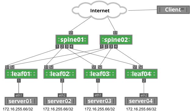 The following image depicts an example anycast network. Each server is advertising the 172.16.255.66/32 anycast IP address.